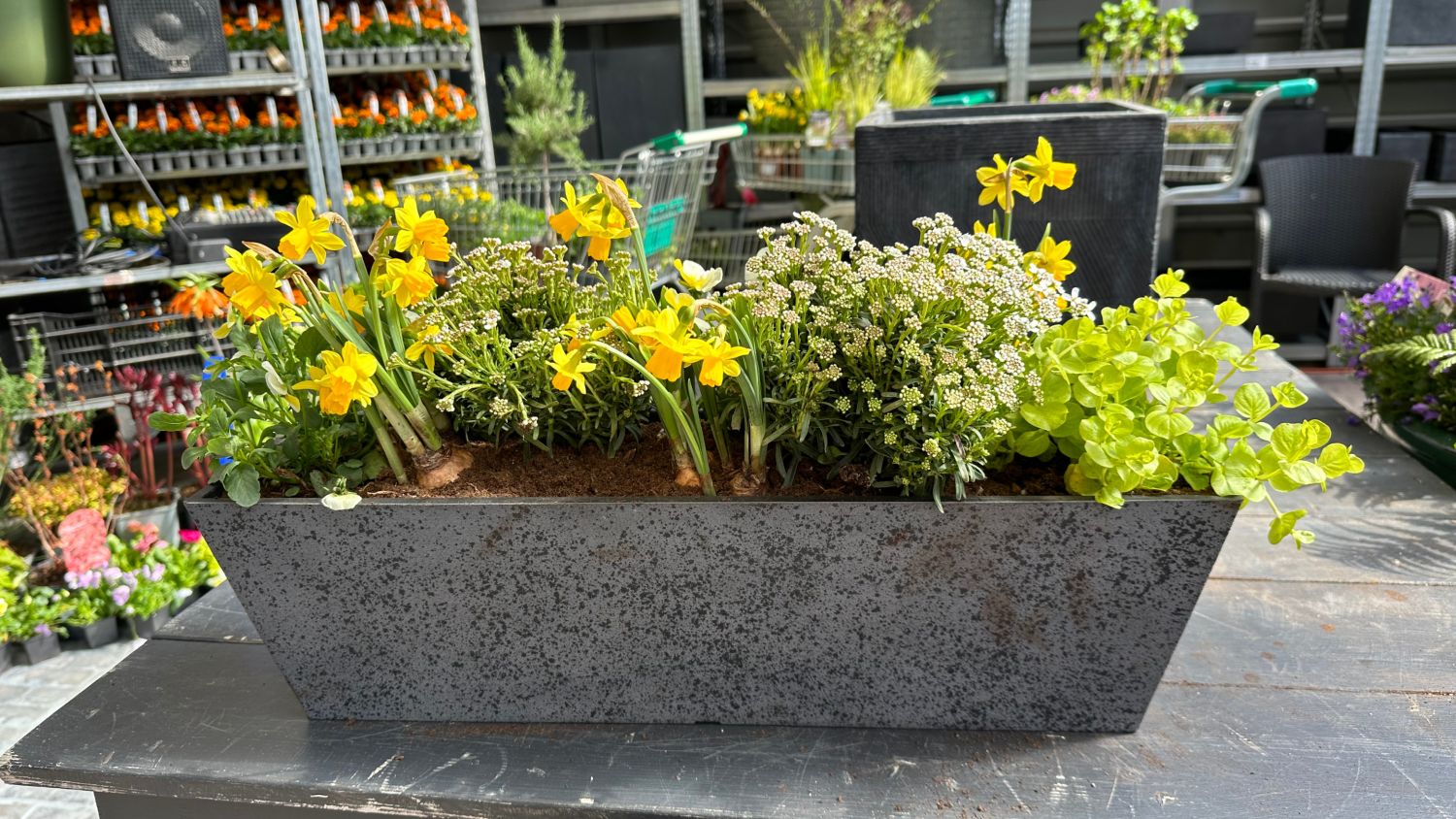 Nartsissid on varajased ja külmakindlad. Näiteks armastatud Tete-a-Tete on väikese kollase õiega ja pikalt õitsev sort. Suuremad valged nartsissid annavad konteinerile omakorda kõrgust. Mõlemad saavad kenasti hakkama ka öökülmaga.