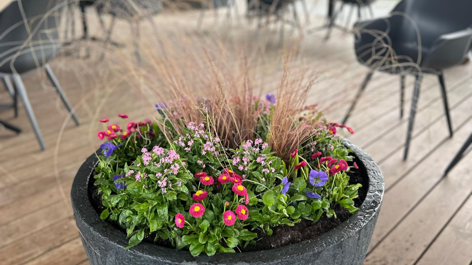 12.Ka anuma valik ise loob meeleolu. Uhked konteinerid Hansaplantist. Kui siduda konteineri värv istutuse toonidega, tekib tervikule lisadimensioon, näiteks lilla anum lillakate õitega.